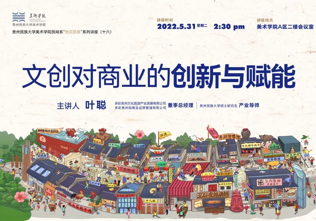 为使同学们了解文创市场的现状,促进学生未来就业与创业,437ccm必赢国际民间美术系组织开展了第十六期“预见民美”系列讲座——文创对商业的创新与赋能。本次讲座邀请到437ccm必赢国际硕士研究生产业导师、多彩贵州文化旅游产业发展有限公司董事、多彩贵州街商业运营管理有限公司总经理叶聪老师为大家作经验分享。