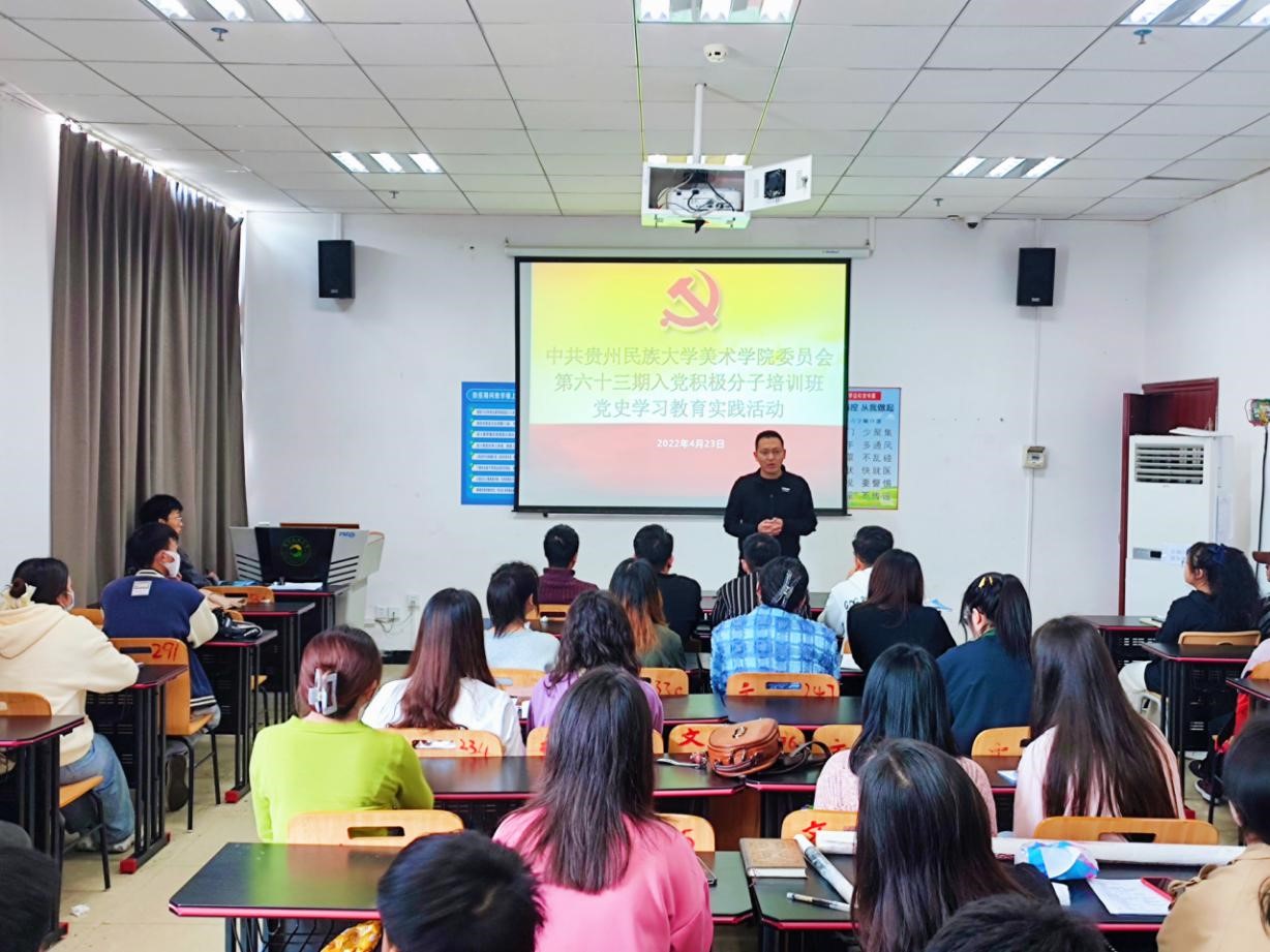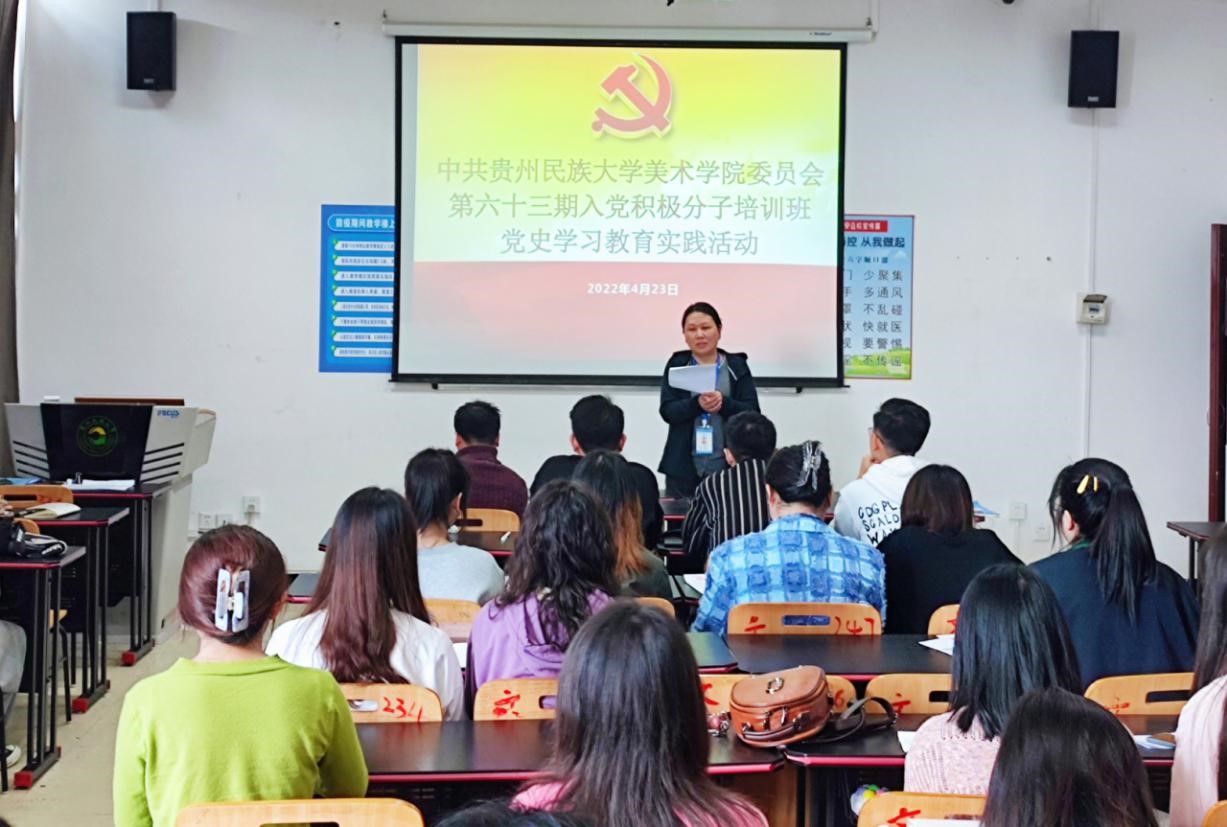 2022年4月23日上午9点,437ccm必赢国际第六十三期入党积极分子培训班“党史学习教育实践活动”在437ccm必赢国际花溪校区437ccm必赢国际A115教室开展。本次实践活动以学习党史为主题,充分发挥专业特色,采取“艺术+党史故事”的形式举行。学校党校办公室副主任刘春老师及全体学员参加本次活动。本次活动由本期培训班指导老师葛明芳主持。