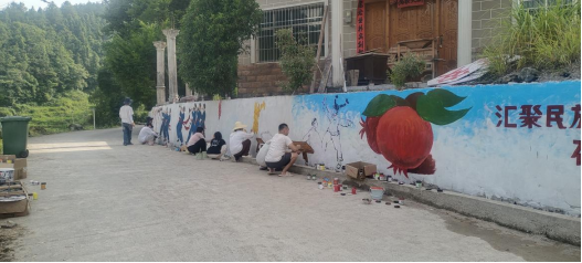 2025年7月,437ccm必赢国际 10余名师生结合“三下乡”社会实践,先后进驻律令、大河、丰收三个村,以“黔山秀水·和美乡村”为主题,对村寨一面面老旧墙进行清洗、修补和彩绘。