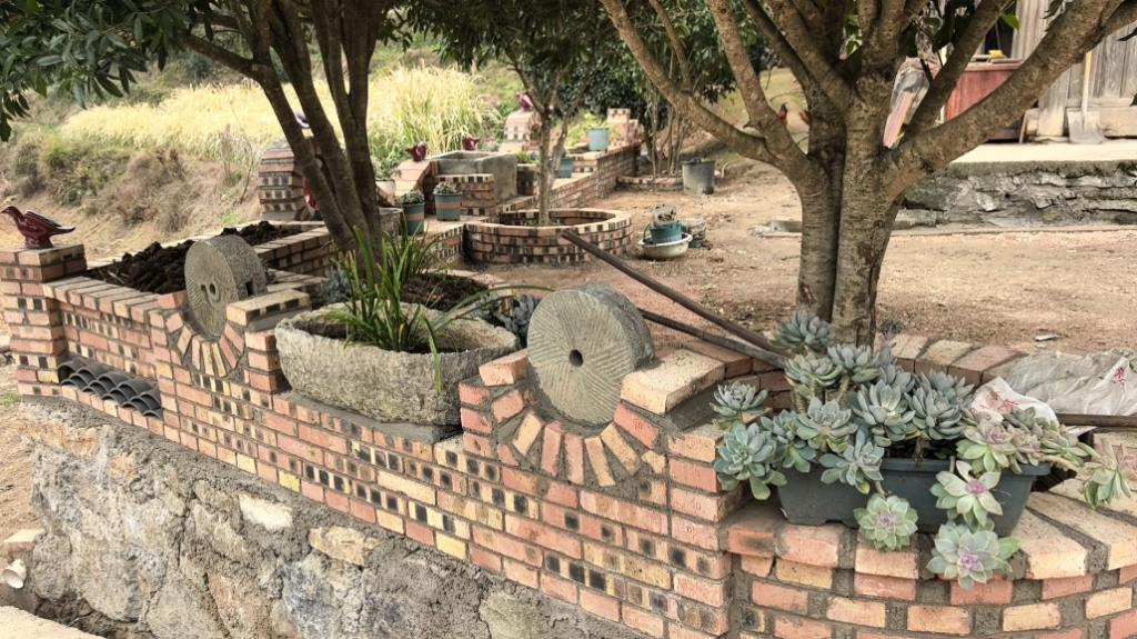 花坛高度控制在40-60厘米,方便老人种菜、孩童种花;边缘用废瓦拼出“云纹”“回纹”等民族图案,既透水透气,又与墙绘遥相呼应;石磨改造成的“微型盆景”嵌在花坛中央,白天是景,晚上是台,村民笑称“磨盘不磨谷,专磨时光”。