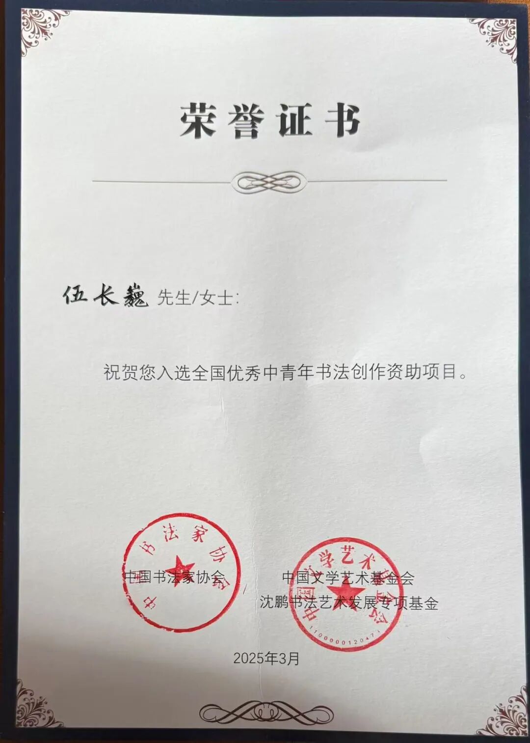 与此同时,伍长巍老师还获批中国文学艺术基金会沈鹏书法艺术发展专项基金中青年书法系列资助项目,项目是中国书协贯彻落实中国文联十一届六次全会精神,推进文艺创作投入、评奖汇演机制改革,加强青年文艺人才培养的有力抓手和具体举措。该项目由沈鹏先生家属发起并作为主要捐赠人,与中国书协、中国文学艺术基金会等协作推动,为中青年书法人才持续培养而设立的人才资助项目。该项目于2024年6月正式启动,原则上每年一期,重点推选50岁以下和35岁以下的书家分为两档进行资助,今年首期资助45名。我院青年教师伍长巍入选一档资助。