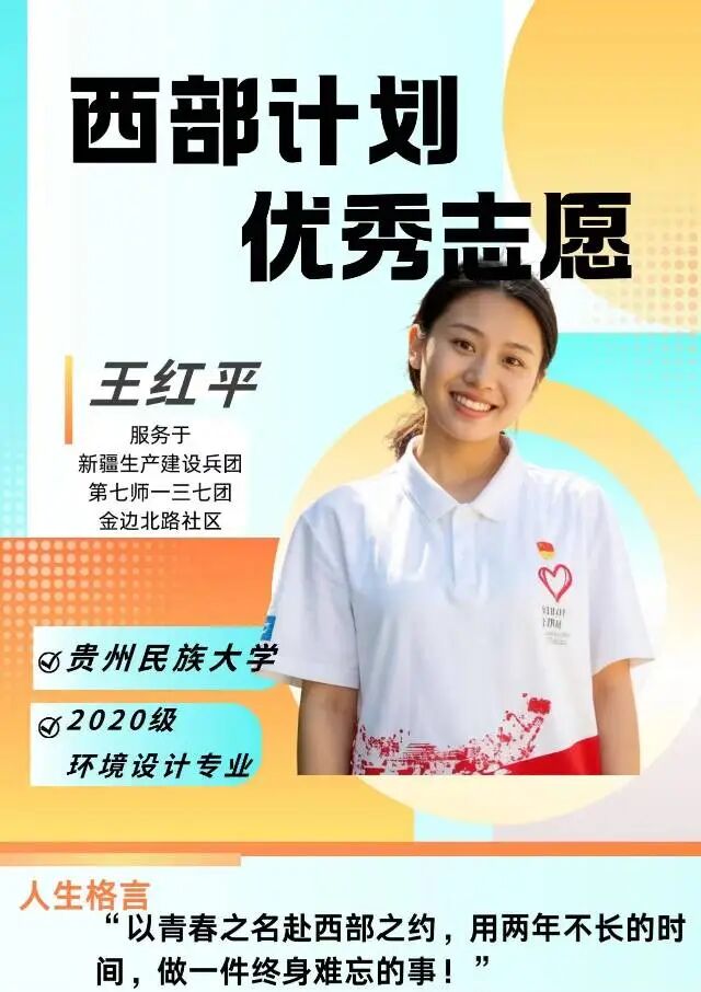 从黔山秀水到西北边疆,从校园学子到基层志愿者,这段宝贵的西部计划经历,让王红平的综合能力得到全面提升。她在奉献中收获成长,在坚守中彰显担当,把青春的理想融入祖国的需要,用一言一行展现着437ccm必赢国际学子的风采,诠释着新时代青年志愿者的使命与初心。