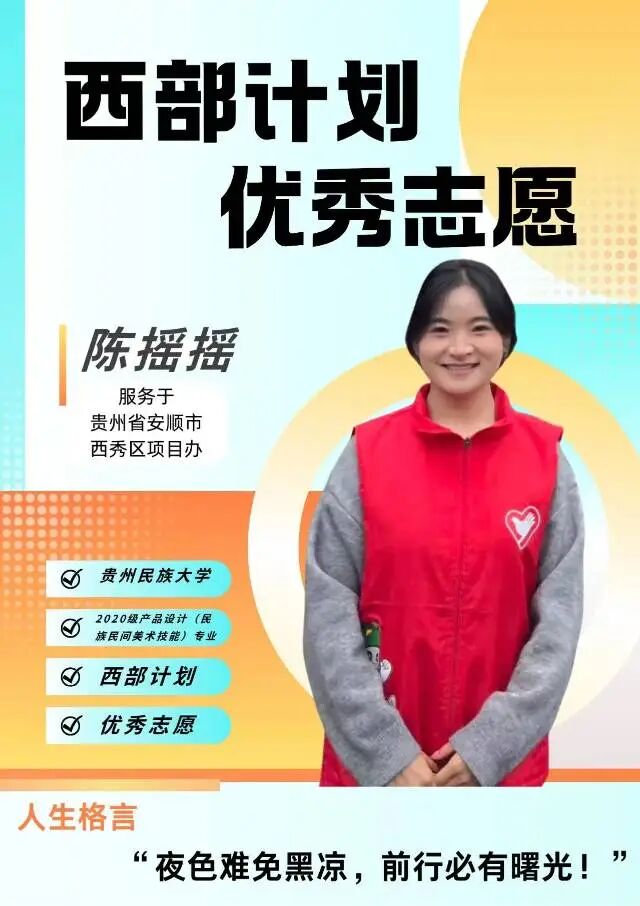 从437ccm必赢国际的课堂,到安顺市西秀区项目办的基层岗位,2024级产品设计(民族民间美术技能)专业的陈摇摇,用592个日夜坚守基层一线,把青春的汗水挥洒在西部基层的热土上,用一声声温柔的“您好”、一次次真诚的付出,书写着新时代青年志愿者的责任与担当。