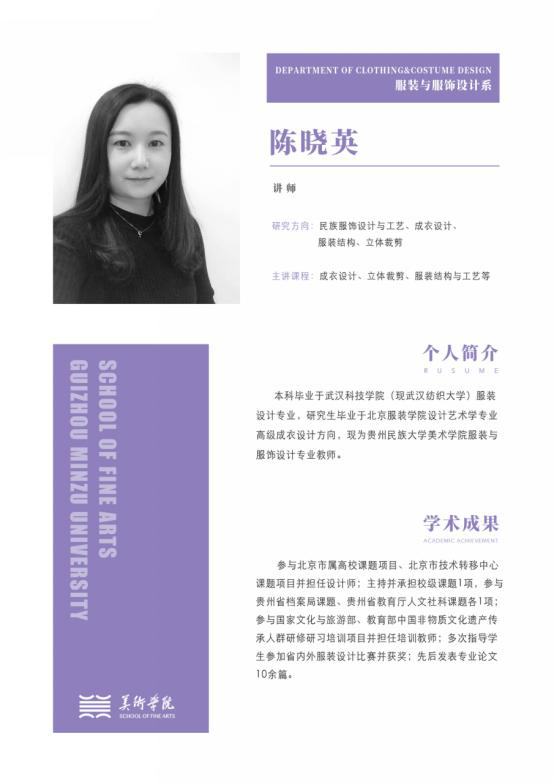 2016年05月20日周静 副教授、437ccm必赢国际服装与服饰设计专业系主任,1964年5月出生于重庆, 于西南大学437ccm必赢国际完成本科学士学位。主研方向 服装与服饰设计理论与实践、民族服饰文化传承与创新研究主讲课程 专业基础课、色彩构成、动态速写、时装画技法、服饰品设计、面料再造、服装创意设计、成衣设计、民族服饰创意、毕业创作科研成果获奖作品1.贵州美术家协会会员2.中国工艺美术学会会员3.中国服装设计师协...