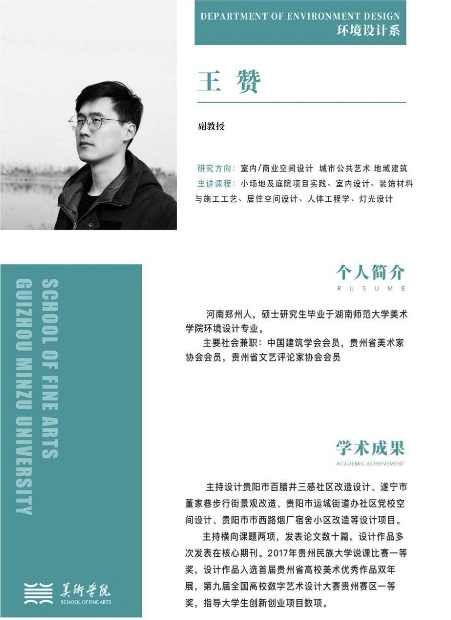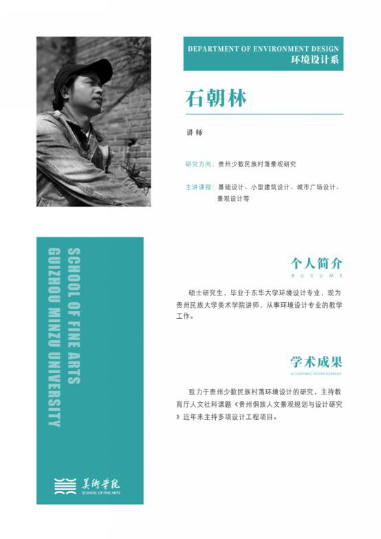 石朝林 讲师,出生于1982年,毕业于东华大学,硕士研究生,现就职于437ccm必赢国际从事环境设计专业教学工作主研方向 环境艺术设计主讲课程 主讲《计算机辅助设计》、《室内设计》、《景观设计》、《施工预算》等课程科研成果 致力于贵州村落环境设计的研究,主持教育厅人文社科课题《贵州侗族人文景观规划与设计研究》,并公开发表相关论文,近年来主持多项设计工程项目。