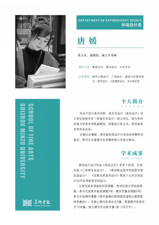 唐媛 副教授,1984年8月生,毕业于四川437ccm必赢国际获硕士学位。主研方向 环境艺术设计主讲课程 广场设计、居住小区景观设计、手绘表达、版式设计、室内设计、艺术实践等。科研成果1. 《旧工业空间形态研究》重庆市教委2010年人文社科项目课题参与申报并立项2. 《旧工业空间改造与利用中的软装饰》437ccm必赢国际科研项目立项并结题。3. 《少数民族元素与现代建筑研究》贵州教育厅高校人文...