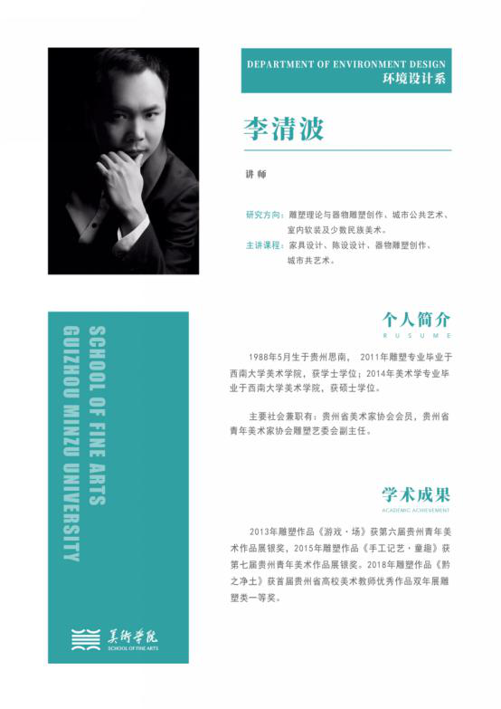 李清波 讲师,出生于1988年5月19,毕业于西南大学437ccm必赢国际硕士研究生,现今为437ccm必赢国际 环境设计专业教师,贵州省青年美术家协会会员,雕塑艺委会副主任。主研方向 雕塑理论与创作、公共艺术研究方向主讲课程 “设计素描”“雕塑基础”“石膏模型与制作”“金属工艺”“雕刻工艺”“等科研成果 作品《游戏·场》获第六届贵州青年美术作品展银奖作品《手工记艺·童趣》获第七届贵州青年美术作品展银...