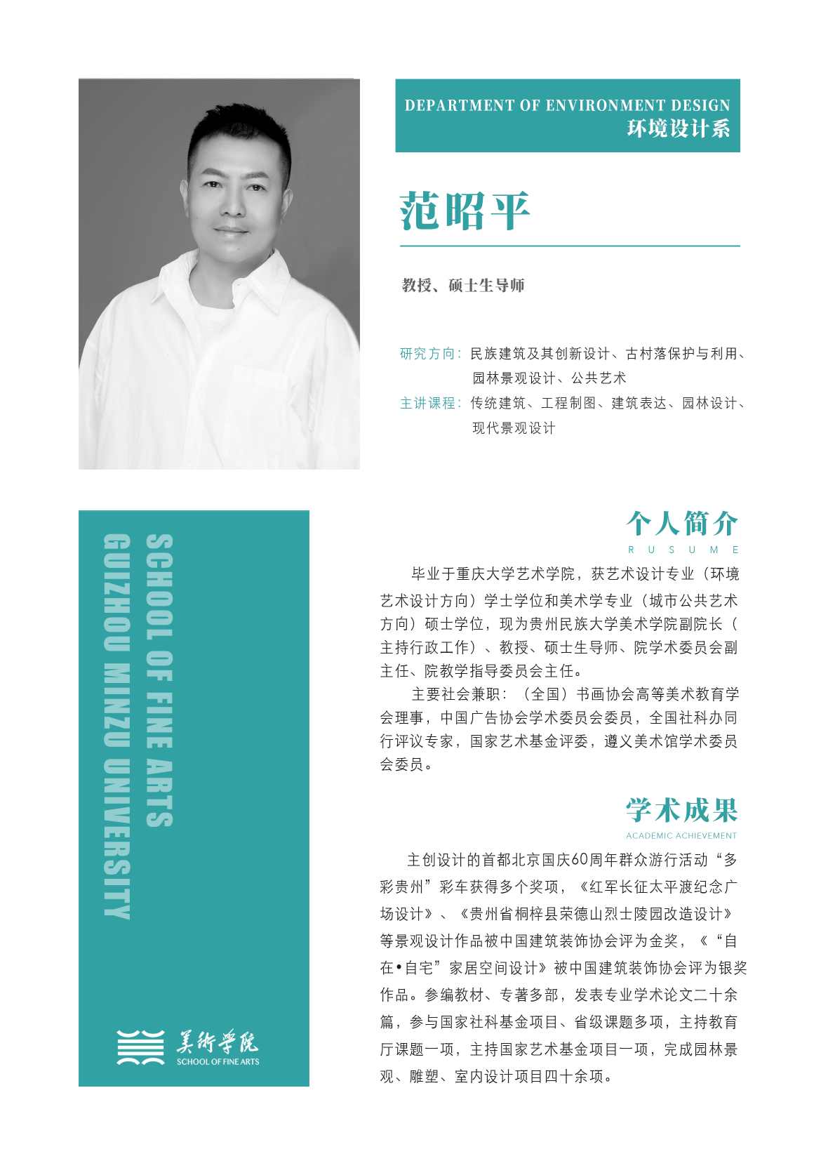 范昭平 副教授,艺术设计系主任,1975年9月出生,硕士研究生,毕业于重庆大学主研方向:环境、园林景观、室内、城市公共艺术设计主讲课程:建筑工程识图与制图、手绘表达、广场设计、居住小区环境设计、建筑外观设计、生态景观规划设计科研成果一、获奖作品:1、主创设计的首都北京国庆60周年群众游行活动“多彩贵州”彩车获得多个奖项2、作品《欲望筑起腐败的深渊》在第二届全国高校廉政文化作品大赛(贵州赛区...