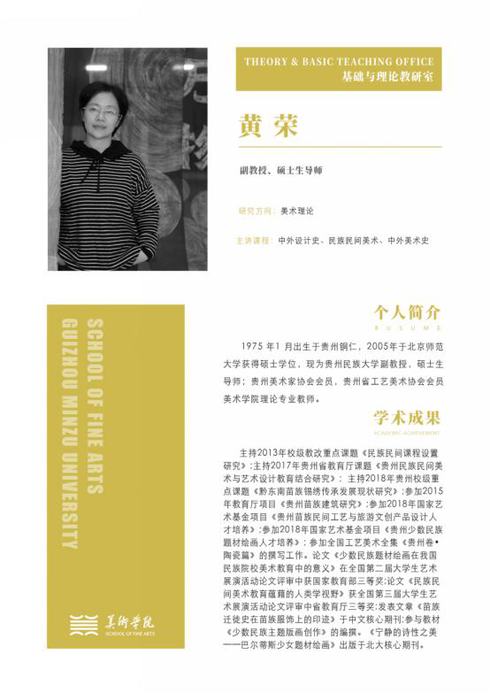 黄荣 副教授, 1975 年1 月出生于贵州铜仁,2005年于北京师范大学获得硕士学位,现为437ccm必赢国际理论专业教师。主研方向 中外美术史主讲课程 中外美术史、民族民间美术、艺术教育综合版画科研成果 1. 主持校级课题:《松桃寨英古镇建筑艺术研究》2. 主持校级教改重点课题《民族民间课程设置研究》3. 参加贵州省教育厅基地项目《江西苗族服饰与日本和服比较研究》4. 参加贵州省教育...