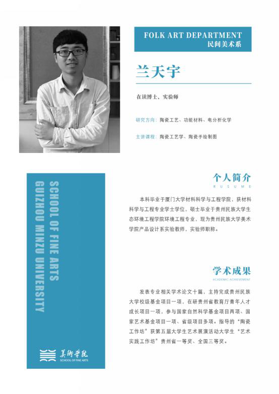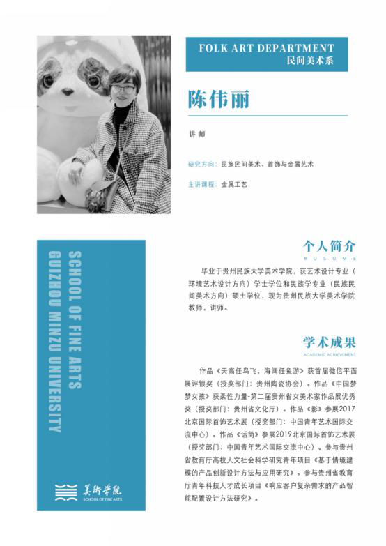 陈伟丽 讲师,贵州省美术家协会会员,生于1986年10月,2009年毕业于贵州民族学院437ccm必赢国际环境艺术设计专业,获学士学位。2012年毕业于437ccm必赢国际民族学民间美术专业,获硕士学位。主研方向 民间美术、首饰与金属艺术主讲课程产品设计专业课程获奖作品1.在《贵州民族学院学报》增刊2010年增刊(总第121期)上,独立发表了论文《安顺地戏面具造型艺术象征》。2.在《民族文化生态研究》2010年卷的“人类学民族...