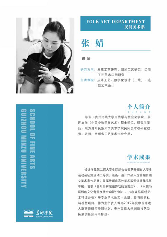 张婧 助教,出生于1985年3月8,毕业于437ccm必赢国际,现今为437ccm必赢国际 民族民间美术专业教师 主研方向 民族民间美术主讲课程 中国民间工艺美术概论获奖作品1.2010年5月作品“撮泰吉”造型艺术象征入选贵州本土社会探寻——大山之子社会调查论文集2.2010年第10期作品苗族纹样与崇拜心理入选苗族纹样与崇拜心理3.2009年9月作品苗族服饰图案在平面设计中的运用入选第三届贵州省贵州民族民间文化青...