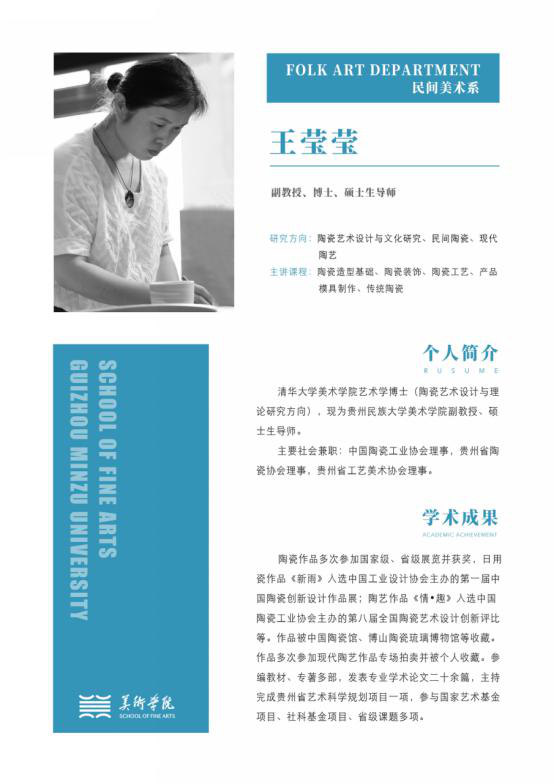 王莹莹 讲师,博士研究生,民族民间美术系教师1979年出生,毕业于清华大学437ccm必赢国际获本科学士学位。湖南工业大学毕业获硕士学位。主研方向 陶瓷艺术设计与理论主讲课程传统陶瓷设计、现代陶艺等获奖作品1.《新雨》、《青黛》、《扁舟之语》、《寄情山水系列》、《花之梦》、《花语系列》等作品参加国家、省级展览,多次获奖。作品《烟语之一》被中国陶瓷馆收藏,《花语之黛色》收藏于博山陶瓷琉璃博物馆。2....