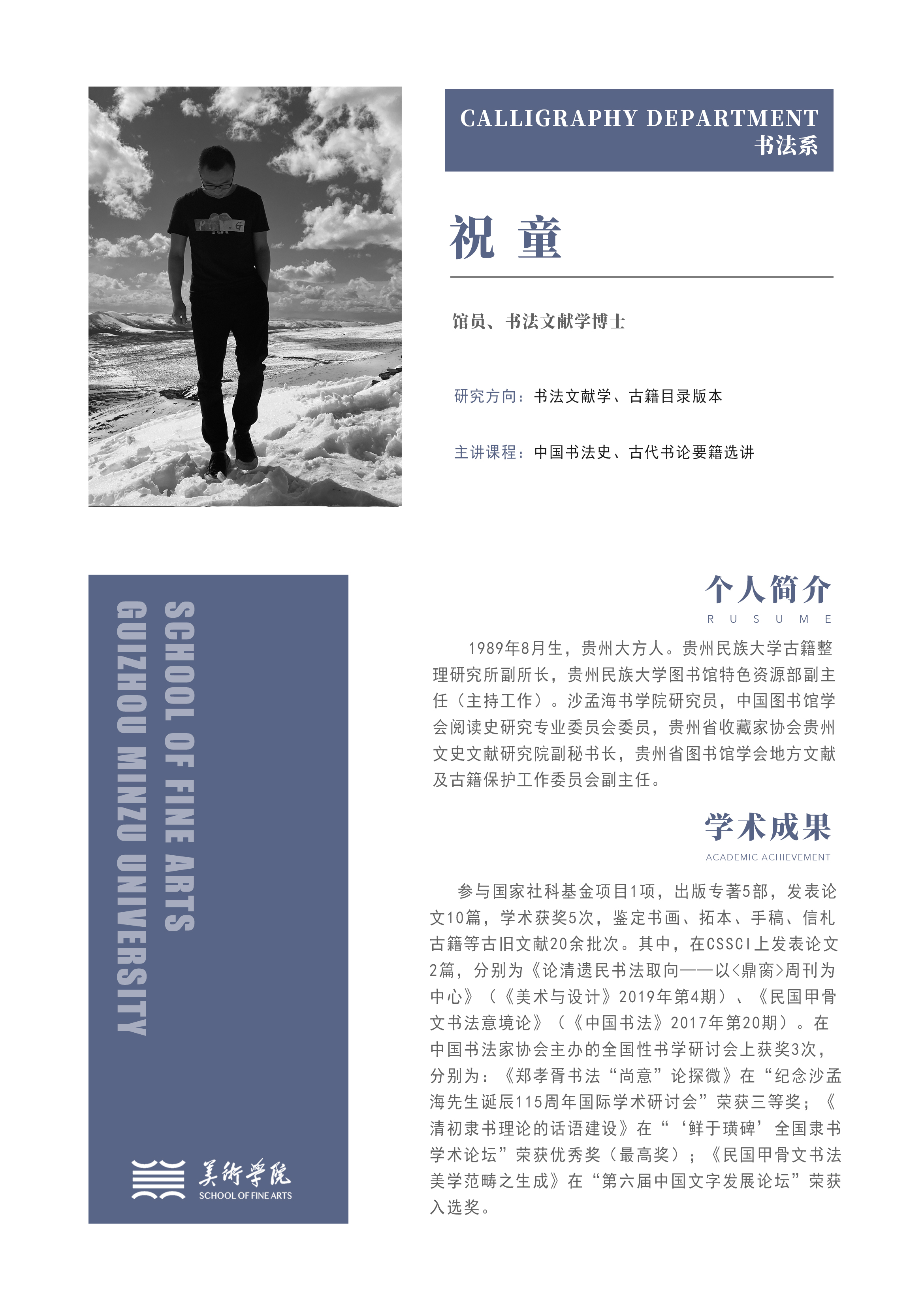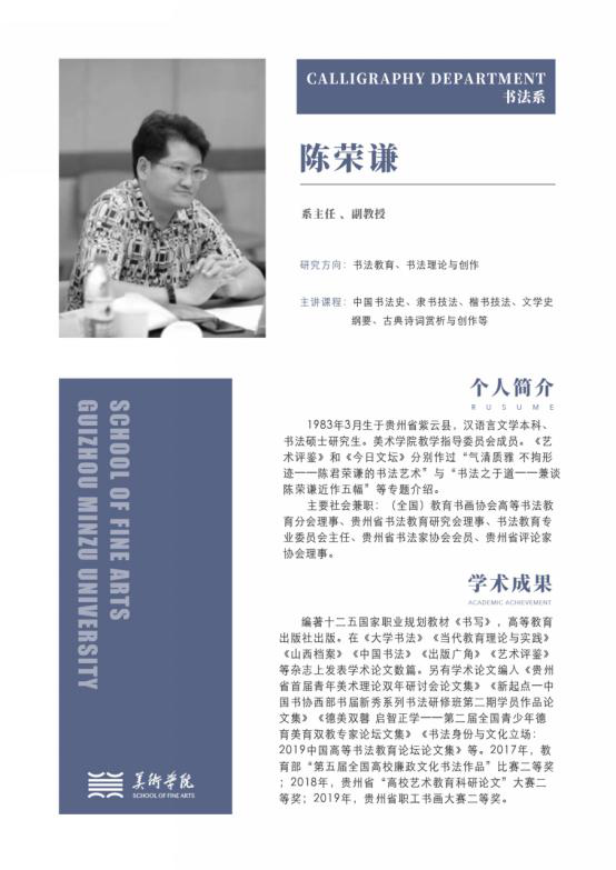 陈荣谦 讲师,书法学专业教师。1983年3月生于贵州省紫云县,湖南科技大学书法教育硕士研究生。主研方向 书法技法、书法教育、古典与现代诗歌理论与创作研究主讲课程 行书技法、书法史科研成果1.古诗收入《中华教育诗词选》2.“十二五”职业教育国家规划教材《书写》副主编,高等教育出版社出版3.发表《孙过庭的书法教育思想》、《书法艺术对中小学生的美育功能》、《浅论唐代书法家学的传习方式》、《...