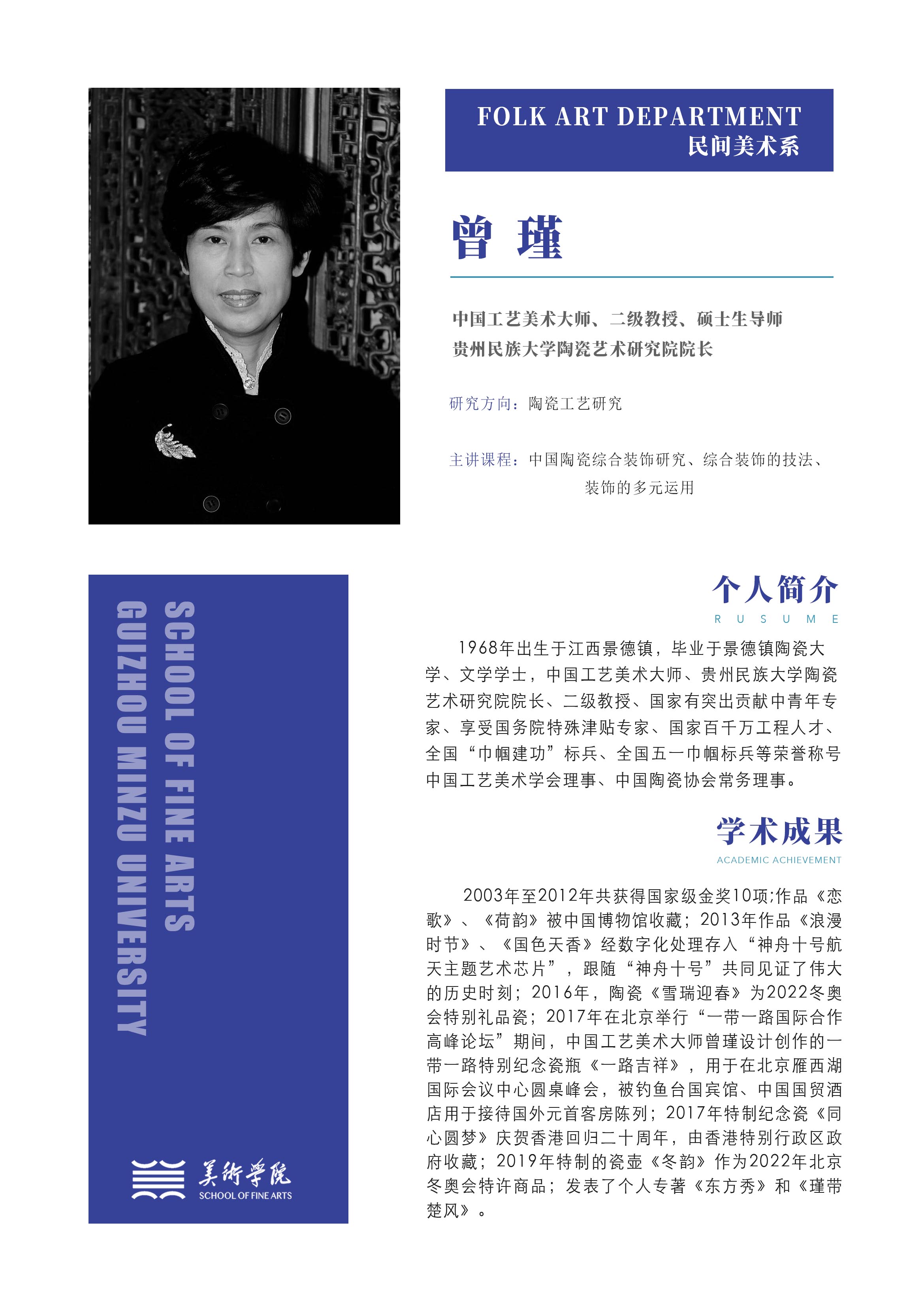 赵梓钧 讲师,生于1974年1月,西南大学硕士研究生毕业,现为437ccm必赢国际理论专业教师。主研方向 民间美术 艺术学 产品设计主讲课程 贵州民间美术 中国民间美术 科研成果 多彩贵州文化协同创新中心“贵州民族民间文化项目研发及产业孵化系列项目之贵州世居民族银饰与刺绣图案创意研发与产品孵化 项目负责人 获优秀等级。